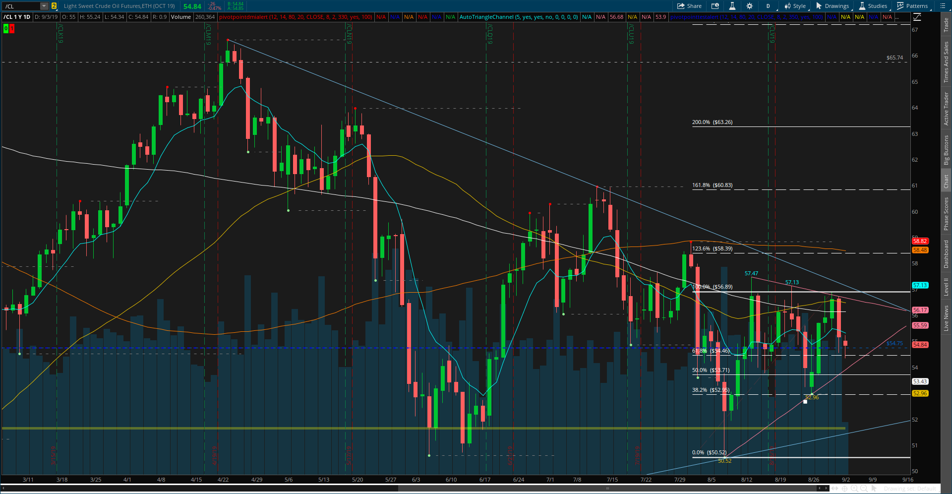Similar to RTY, Crude Oil is in a bearish trend. However, all eyes are on Hurricane Dorian to see how price reacts. Right now if crude oil can hold this lower trendline and 1/3 back on the daily (~54.50), we might see price rally back up towards the 50 and 200 day smas and upper downtrend line. If support fails, back down to $53 we go to test support and potentially lower to 51-52. Crude oil inventory is this Thursday so definitely something to watch if you trade CL.